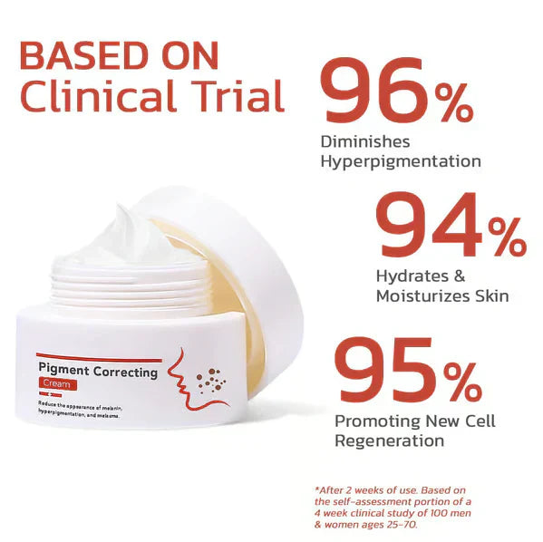 The active ingredients present in Pigment Correcting Cream work by reducing the skin's melanin production, breaking up existing melanin clusters, and promoting the growth of new, healthy skin cells, thereby lightening hyperpigmentation.